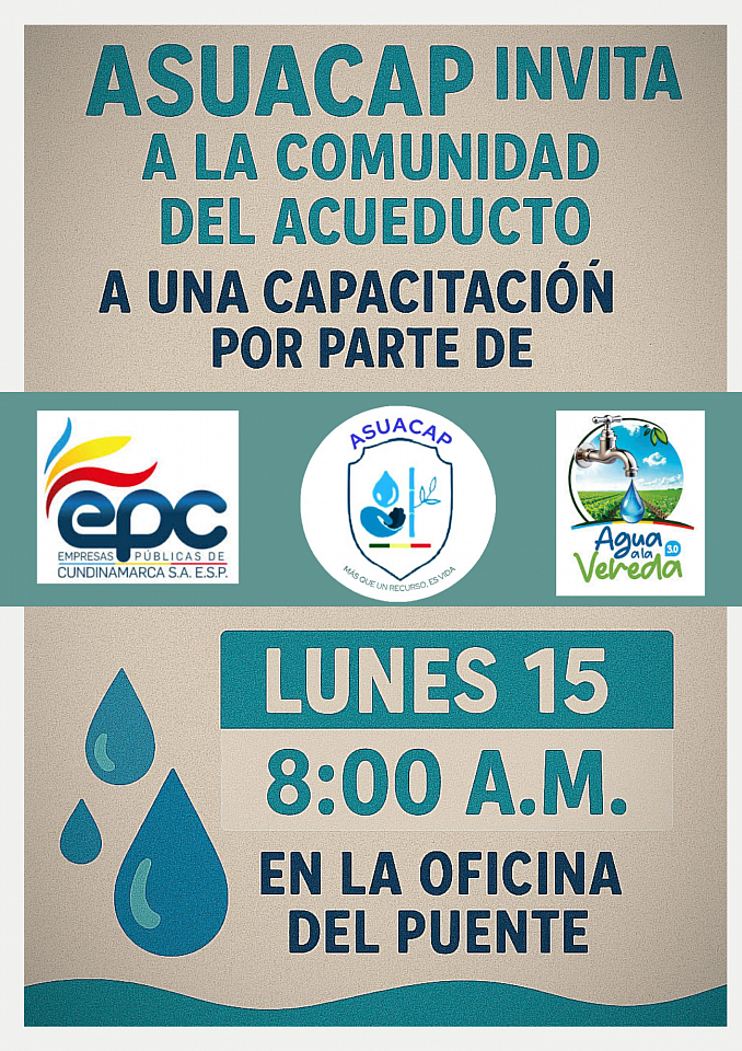 ASUACAP invita a todos los miembros de la comunidad del acueducto a una capacitación esencial. Esta jornada es posible gracias al apoyo de Empresas Públicas de Cundinamarca S.A. E.S.P. (EPC) y el programa Agua a la Vereda.