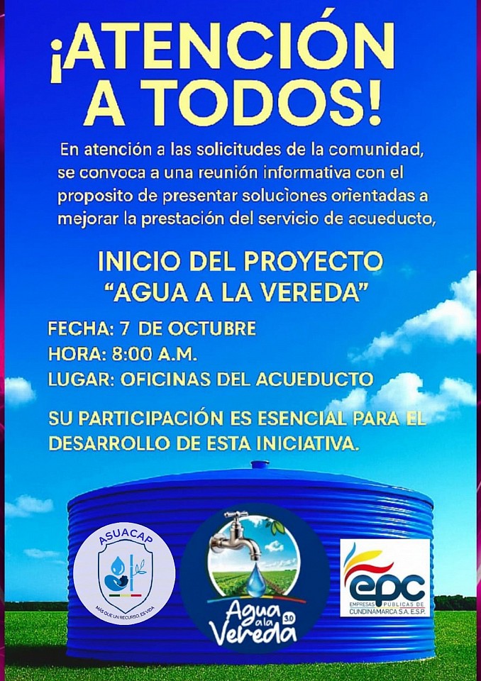 Le pedimos que asista a las reuniones de socialización anunciadas (como la del 7 de octubre a las 8:00 A.M. en las Oficinas del Acueducto) y contacte a la Junta Directiva para conocer las fechas de todos los encuentros.